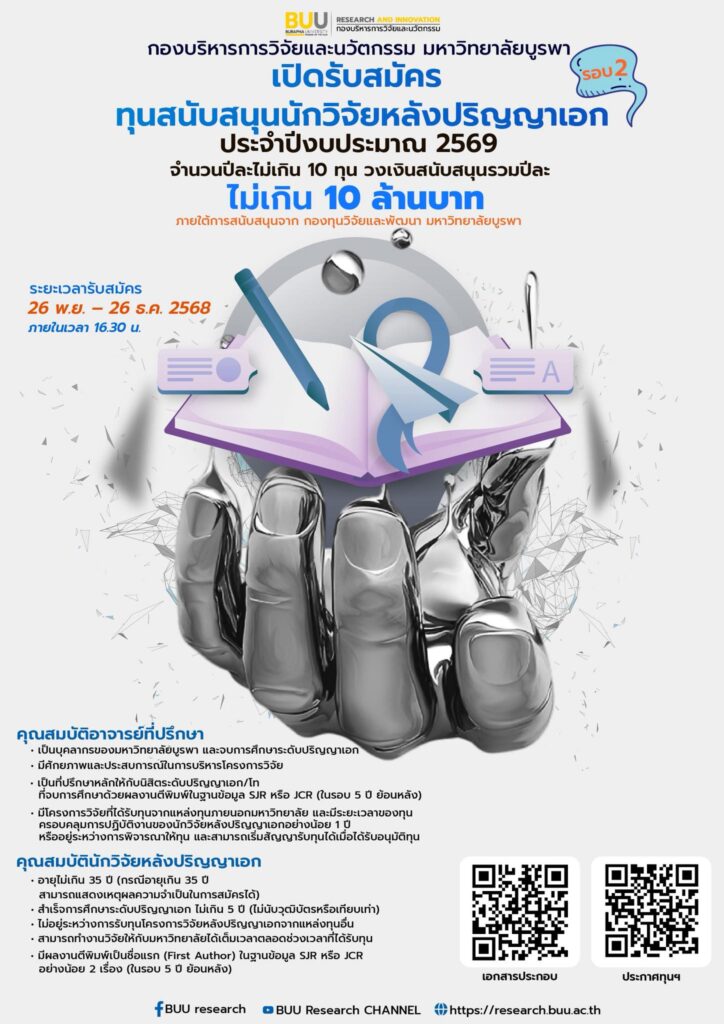 - ประกาศมหาวิทยาลัยบูรพาที่ 1040/2568 เรื่อง รับสมัครคัดเลือกบุคคลเข้าทำงานเป็นลูกจ้าง โครงการวิจัยตามแผนงานเสริมสร้างความเข้มแข็งและธรรมาภิบาล ในการบริหารจัดการแผนงาน และโครงการวิจัยและนวัตกรรม ปีงบประมาณ 2568 จำนวน 2 อัตรา สังกัดกองบริหารการวิจัยและนวัตกรรม ครั้งที่ 4/2568